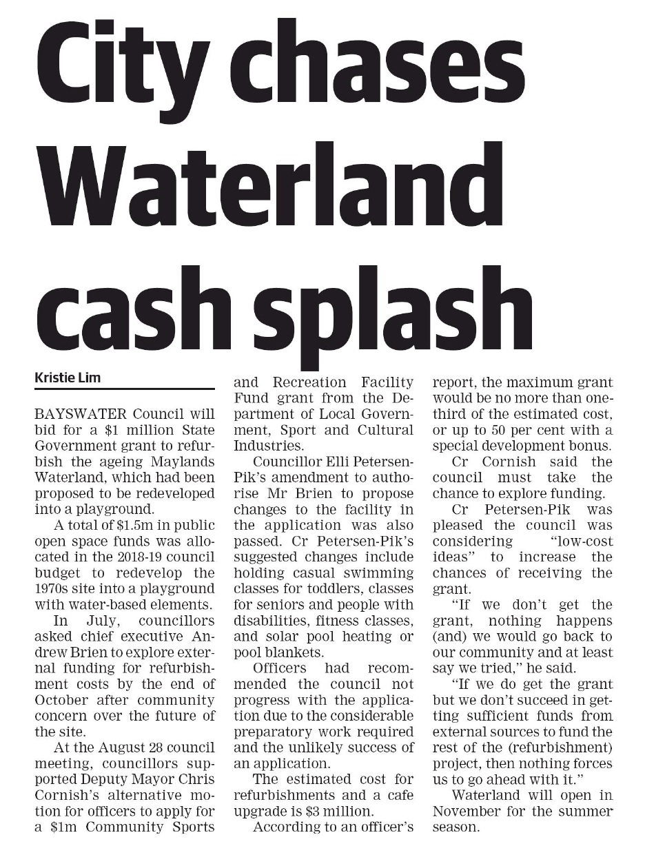 On Council, I continued to push Council to provide a firm commitment to refurbish the site, as a water-based facility for young kids. When Council decided to re-build, I was successful in advocating for one shallow pool to be included in Stage 1 of the project, alongside the water splash pad.